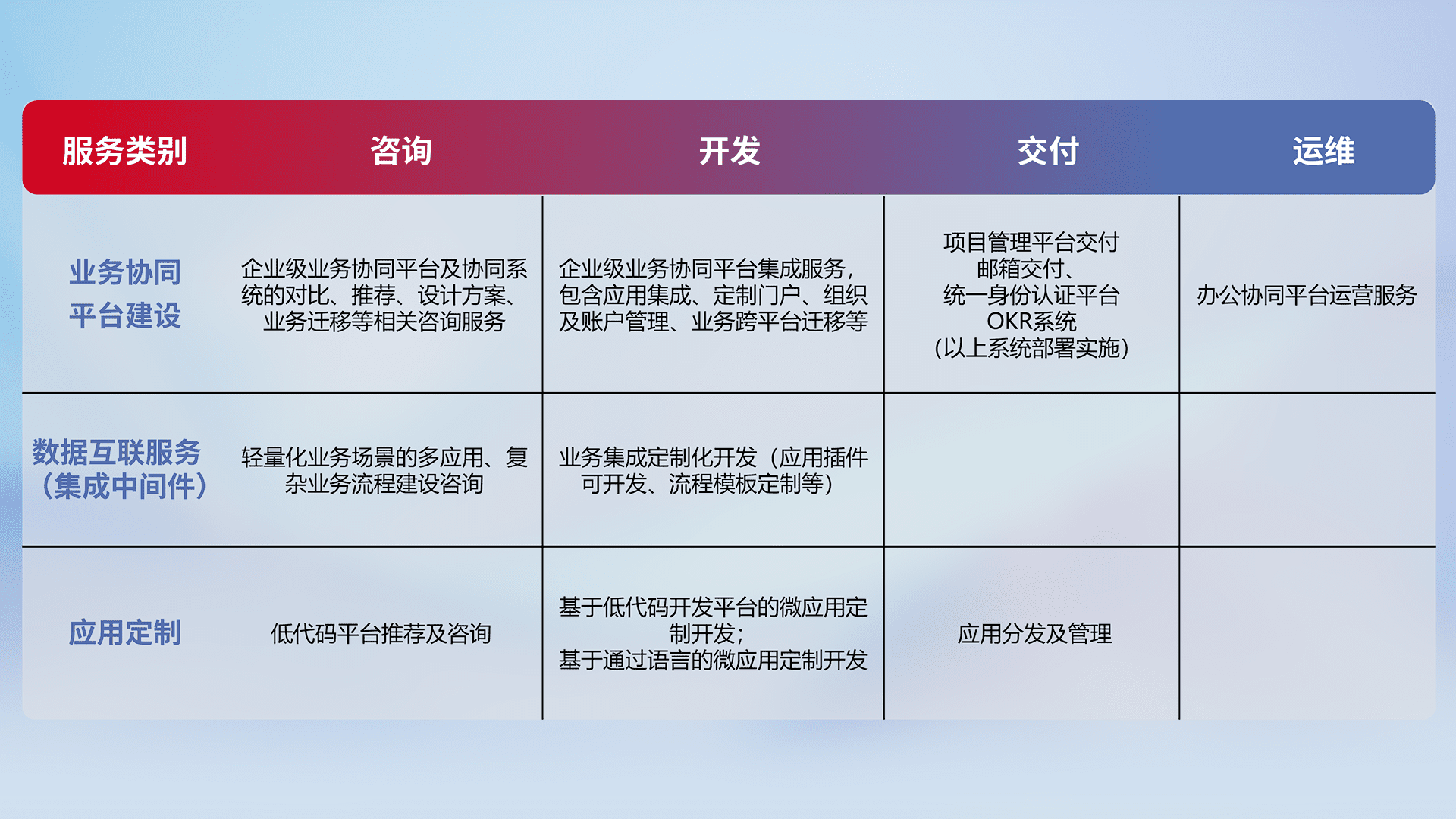 针对钉钉、、企微、、、IDaas等平台级产品提供产品的规划、、、、方案、、交付、、、定制化开发等服务,,实现如统一协同办公、、、、智能客户服务、、、、混合会议管理、、智能数据查询、、等业务场景,,实现数字化转型。。。